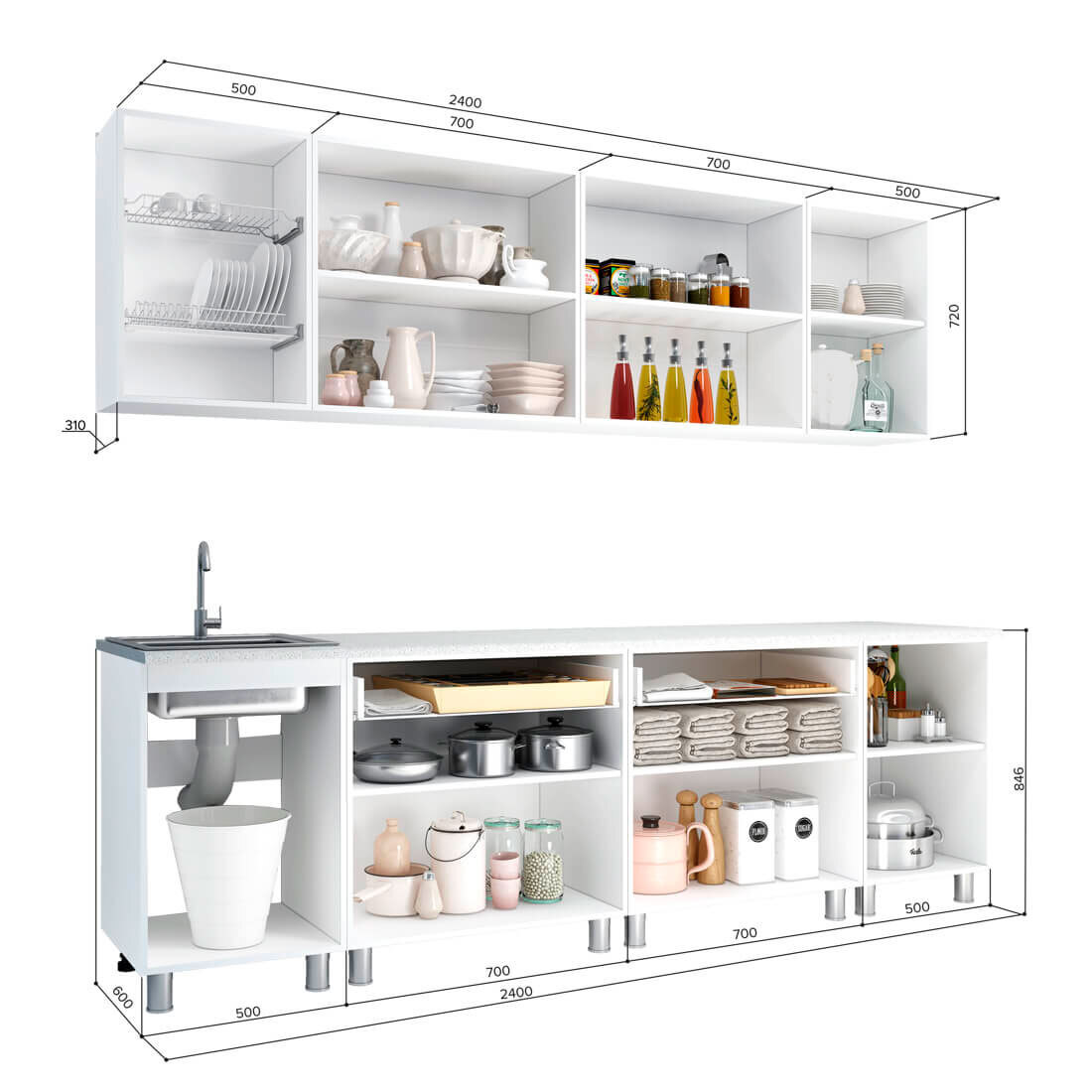 Габаритные размеры композиции нижних модулей с учётом столешницы (ШхВхГ): 2400х846х595
