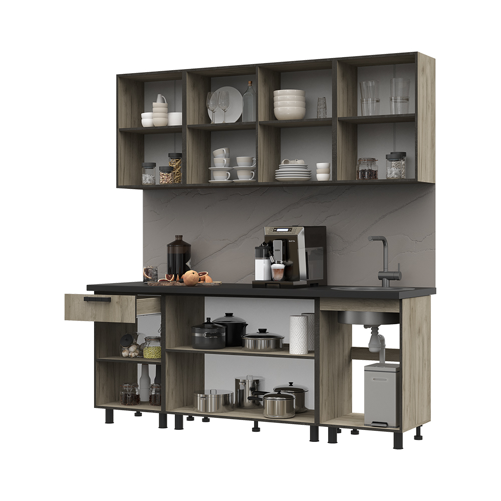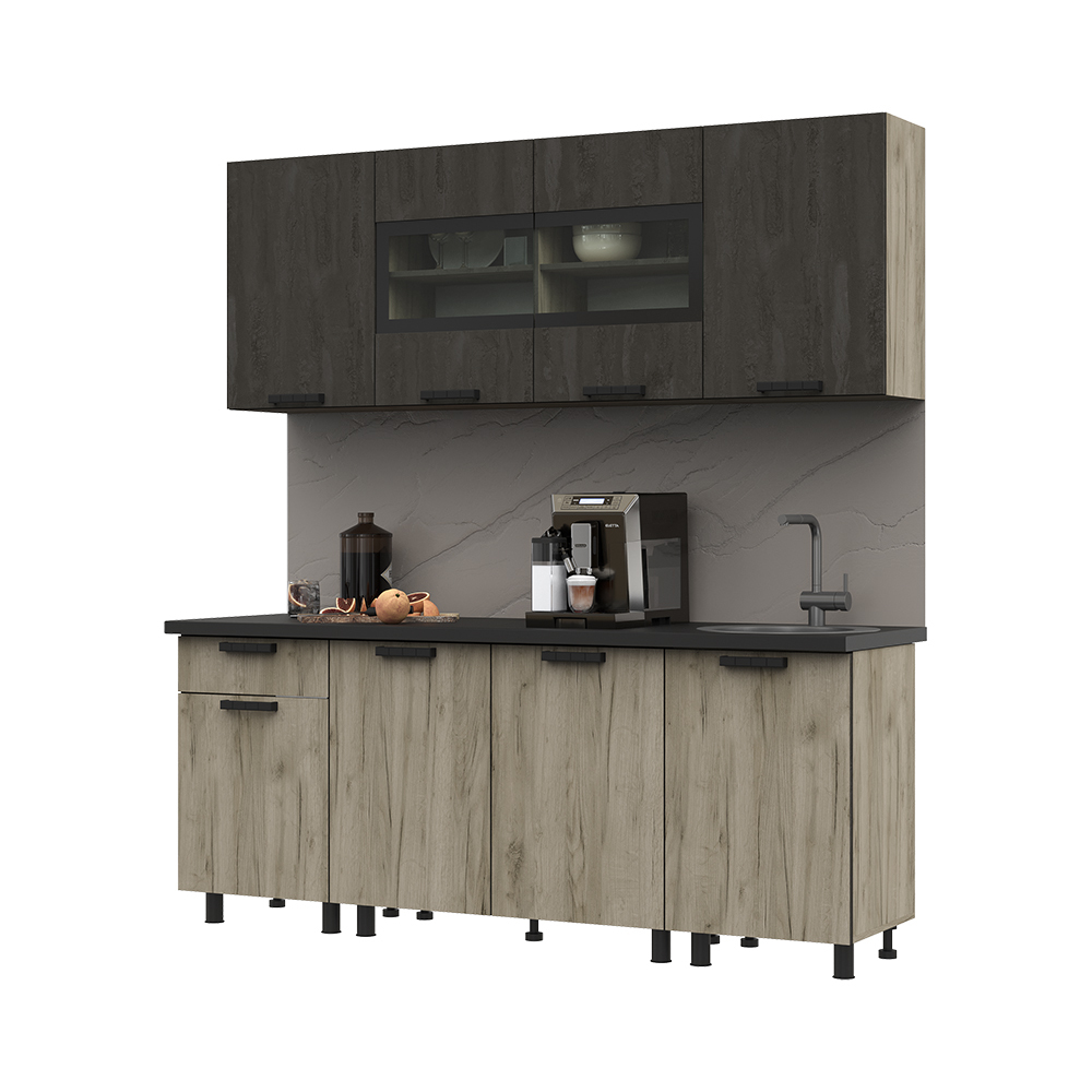 Размер гарнитура: (ШхВхГ) 2000х2160х600 с учетом высоты опор и столешниц.