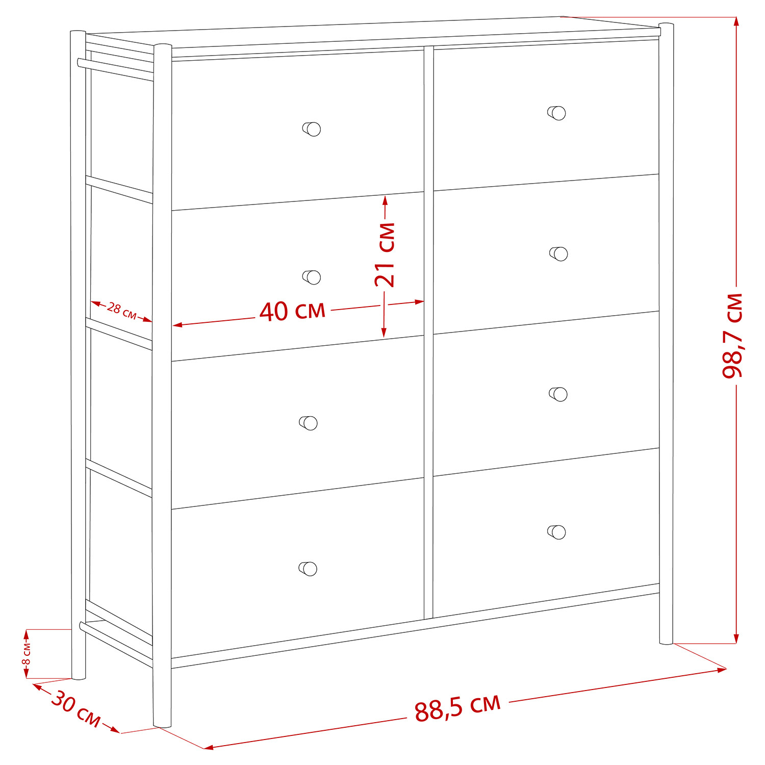 Комод «Хайди 8» в стиле модерн – идеальное решение для продуманной организации небольшого пространства, хранения предметов офисного и домашнего быта. Произведен из экологичных материалов – профильной трубы и полки из ЛМДФ. Ящики – нетканный материал спанбонд (по бокам) – дышащий и безвредный и экокожа, которая легко моется без специальных средств. Прочный и долговечный: стальная рама и водостойкая деревянная столешница обеспечивают стабильную поддержку и гарантируют долгие годы использования. Конструктив выдерживает большие нагрузки (до 30 кг на полку). Регулируемые пластиковые ножки защитят пол от царапин, а также предназначены для неровной поверхности. Безопасно: не бойтесь размещать комод, прикручивайте комод к стене с помощью шурупов, которые идут в комплекте!