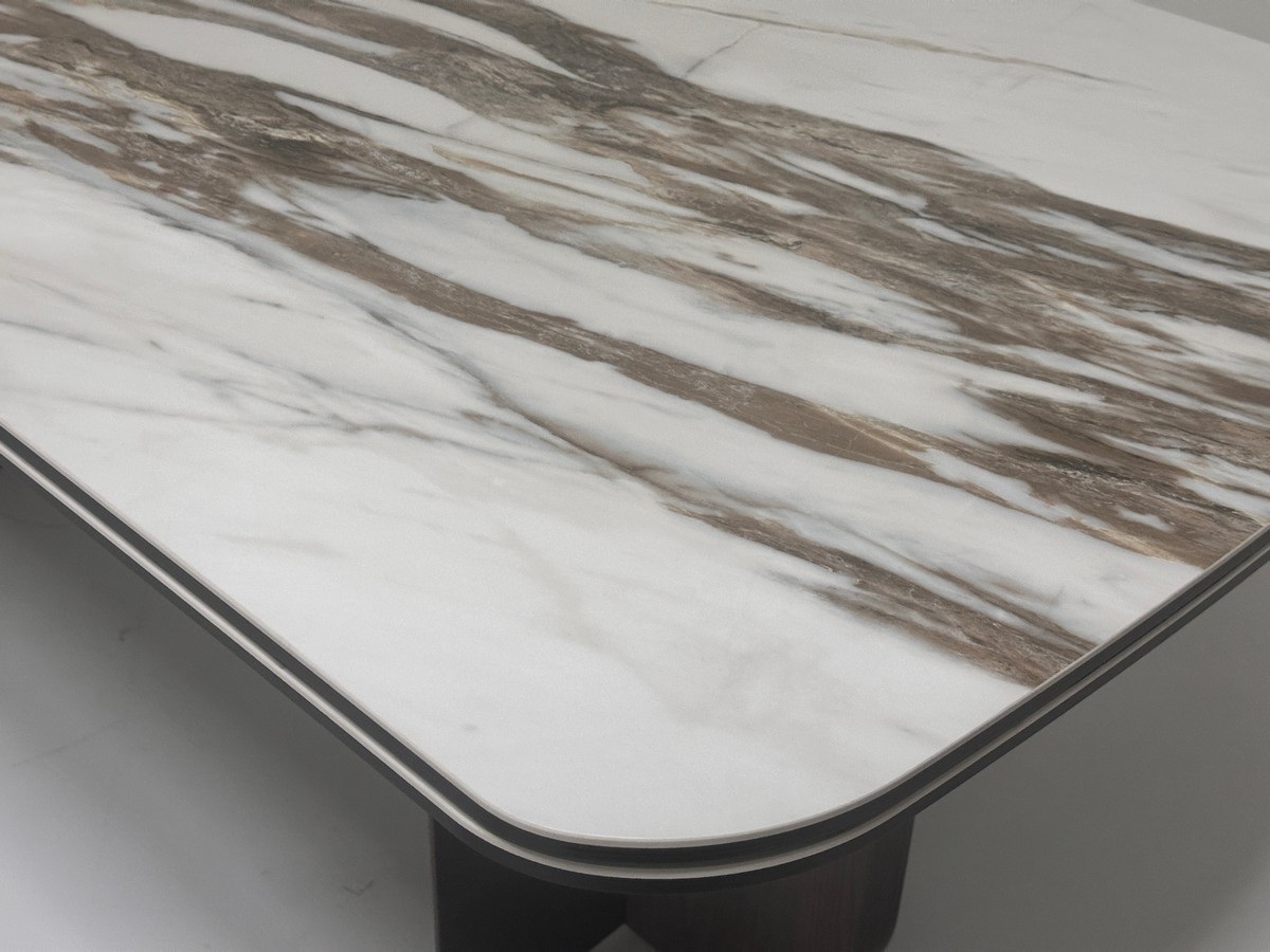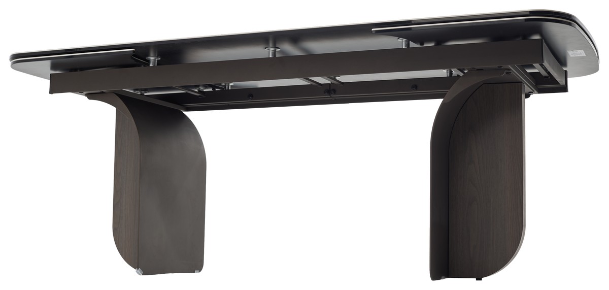 - двухсторонняя торцевая система раскладывания, две независимые вставки по краям по 50 см позволяют увеличить длину столешницы до 250 или 300 см при необходимости, глянцевая керамика, толщина столешницы 15 мм (5 мм керамика + 10 мм закаленное стекло), не впитывает загрязнения, термостойкая;