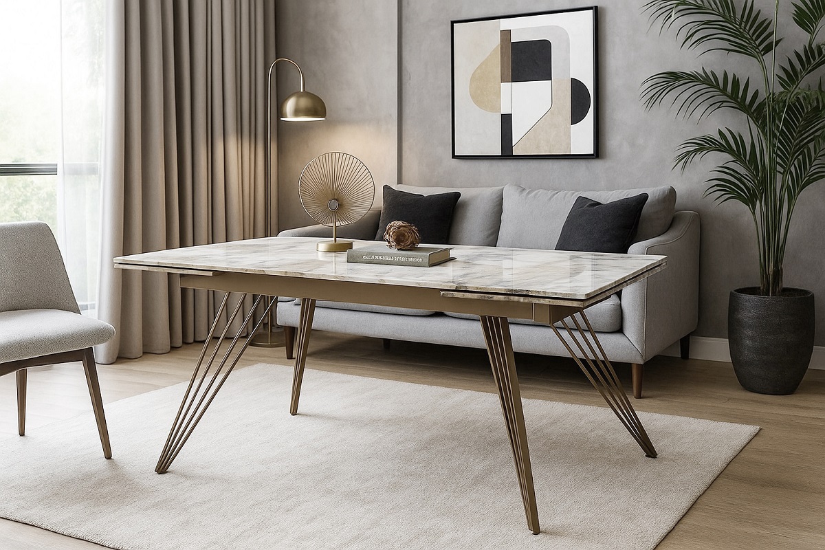- Столешница выполнена из высококачественной керамики толщиной 11 мм — устойчива к царапинам, не впитывает загрязнения, выдерживает высокие температуры. Глянцевая поверхность придаёт столу изысканный вид.